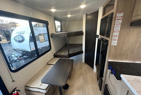 This Cherokee Wolf Pup 17LP is perfect for a family who wants something easy to tow and easy to go! This Wolf Pup sleeps 6 people with double over double bunks and a front, fixed queen bed. Enjoy all the amenities that you need in a compact camper that is just over 3,000 lbs!