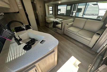Catalina's Legacy Edition Campers include upgraded amenities like a fireplace and outdoor kitchen. It also means they are equipped with a heated and enclosed underbelly. This line of campers is the top-tier for Coachmen Catalina.