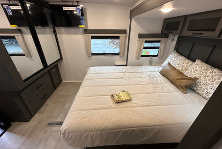 60”x 80” Queen Bed Two Slideouts – In the Bedroom and the Living/Dinette Area Available with Free-Standing Dinette or Convertible Booth Dinette (Currently In Stock with Booth Dinette)