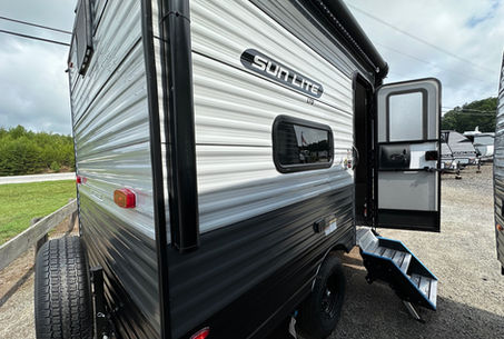 This lightweight camper, the SunLite 13BH, is perfect for smaller tow vehicles! It sleeps 4 with bunks. The top bunk lifts up to allow for seating on the couch underneath. That couch transforms into a bunk bed, as well. It's hard to find a camper this size that has a REAL two-piece bathroom (NOT A WET BATH!).